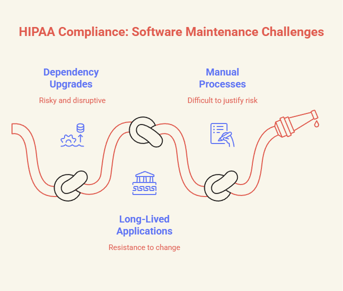 This is where HIPAA compliance often collides with engineering reality. Many healthcare systems rely on long-lived applications that teams are understandably cautious about changing. Dependency upgrades can feel risky, especially when APIs change or transitive dependencies introduce unexpected behavior. As a result, libraries remain outdated long after fixes are available, increasing exposure even when no immediate incident has occurred.